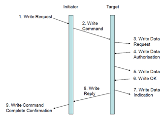 The write command provides a means for one node, the initiator node, to write one or more bytes of data into memory of another node, the target node on a SpaceWire network. The operation of the write command is illustrated.